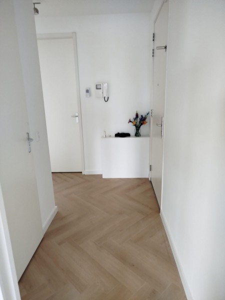 Binnen twee weken is het appartement volledig getransformeerd. De bestaande vloer is verwijderd en vervangen door een integraal vloerverwarmingssysteem door het gehele appartement. Vervolgens is een duurzame visgraat PVC-vloer aangebracht inclusief nieuwe plinten. Daarnaast zijn diverse installatietechnische aanpassingen uitgevoerd, waaronder het optimaliseren van lichtpunten, wandcontactdozen en schakelmateriaal. Het volledige appartement is gestuct en gesaust voor een uniforme, hoogwaardige afwerking.